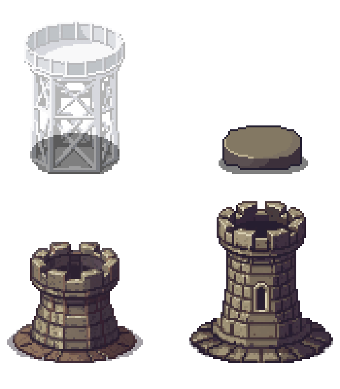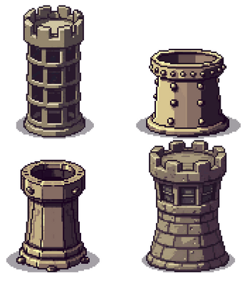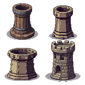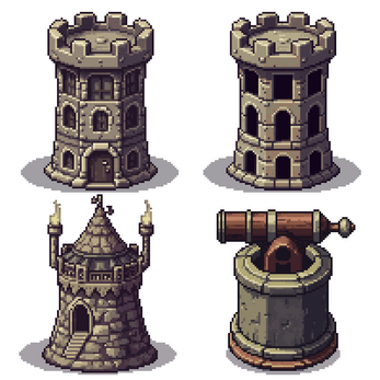 This asset pack gives you a complete set of pixel art towers, perfect for prototyping or finishing a small indie TD project.